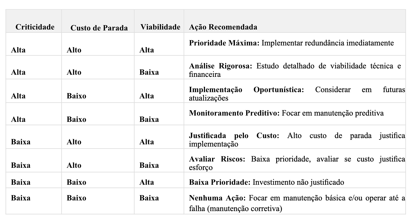 A matriz abaixo cruza criticidade do sistema, custo de parada e viabilidade da implantação para priorização de investimentos em redundância: